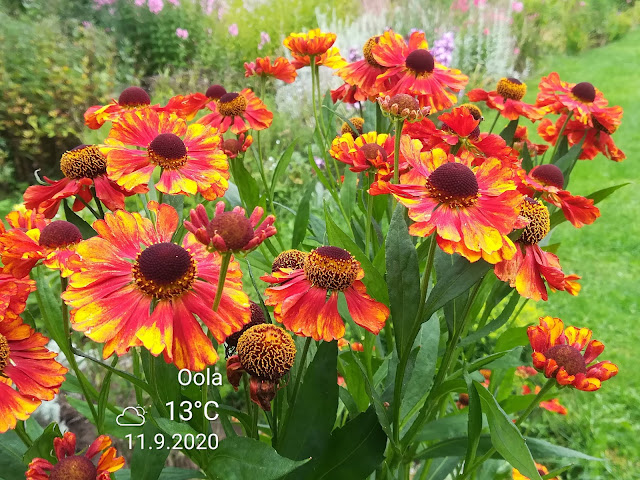2.Kollane on väga kõrge, võimas põõsas. Helenium 'Zimbelstern´kirjeldus on kõige lähedasem sellele taimele.3.Tema nimi on Helenium x hybridum ´Chelsey' Kõrgus 60-80. Vaskpunased korvõied augustist oktoobrini. Karmiinpunased õied, millel on erekollased pritsmed, väiksem kultivar, mis on kompaktsem kui enamik heleniume.
